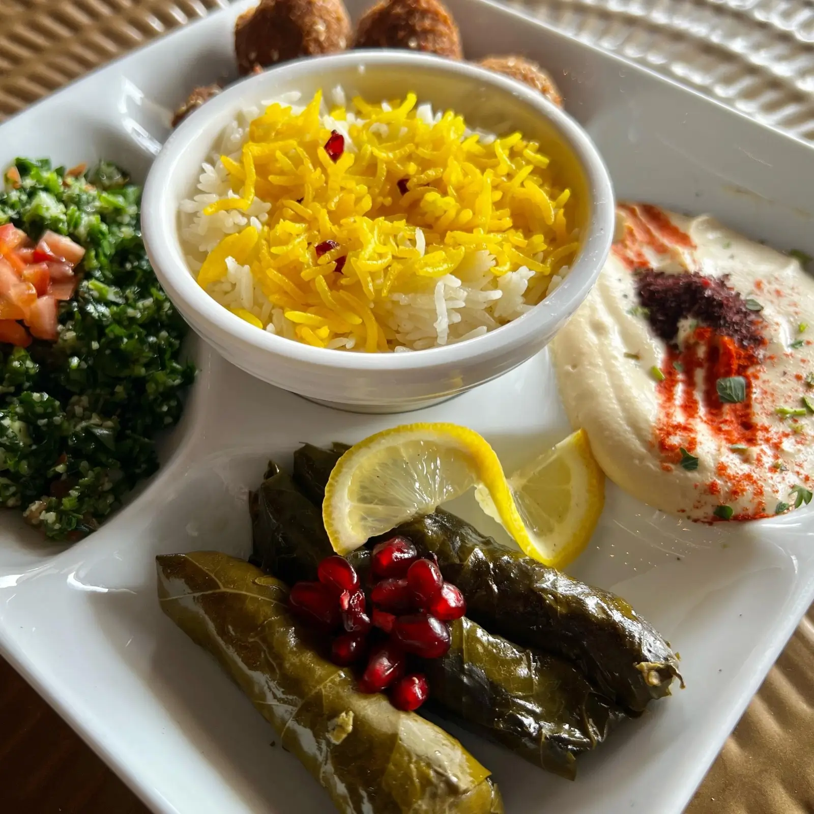 Vegetarian. Lettuce, Cucumbers, Tomatoes, Mint, Fried Pita Chips & Pomegranate Dressing